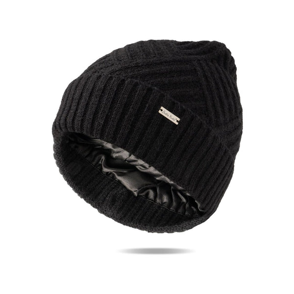 Wrap your head in cozy comfort with this diamond knit beanie in black. The silky satin lining keeps your hair smooth and frizz-free, so you can look polished whether you're heading out or just staying in. Perfect for chilly days when you want style without the hat hair drama.