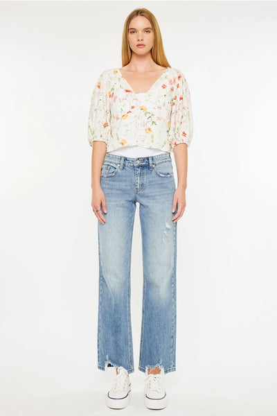 These Kan Can mid-rise true straight jeans bring effortless cool to your wardrobe. The medium wash pairs perfectly with the little distressed details and destroyed hem for a trendy, worn-in vibe. Crafted with comfort stretch fabric, they move with you all day long. Featuring a classic 5-pocket style and zipper fly, these jeans are as practical as they are playful. With a 9½" rise and 31" inseam in size 5/26, they fit just right for a flattering silhouette.