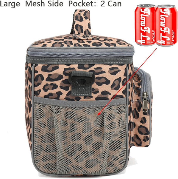 Leopard flow fly insulated lunch box. Has mesh pockets and shoulder strap.